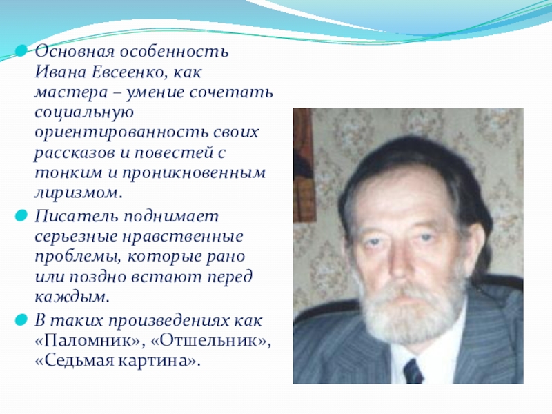 Основная особенность Ивана Евсеенко, как мастера – умение сочетать социальную ориентированность своих рассказов и повестей с тонким