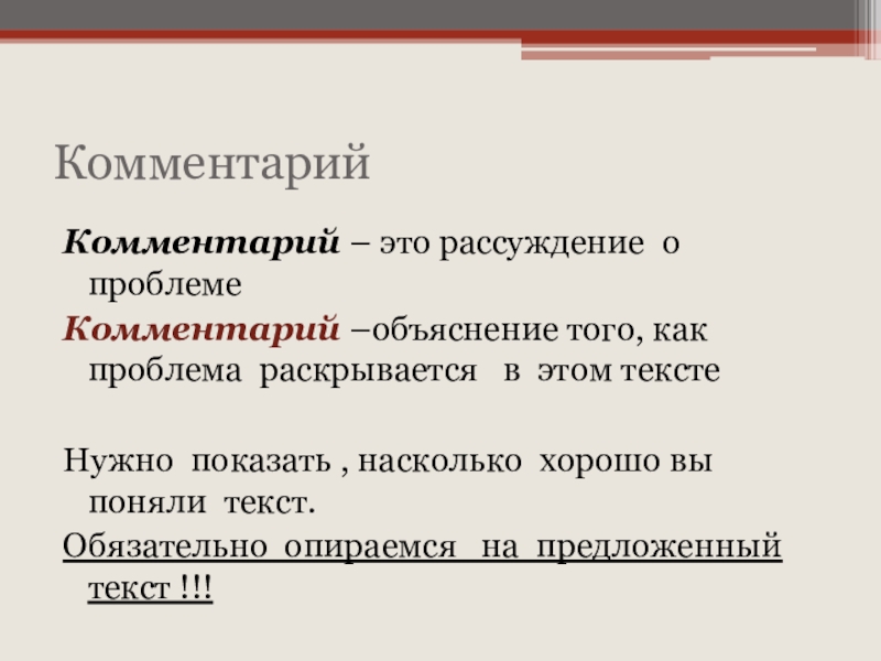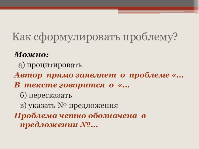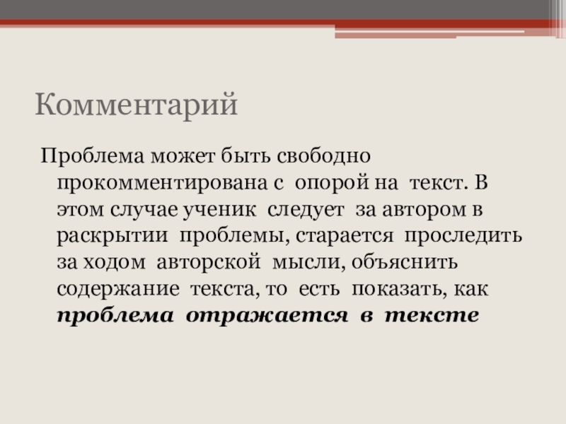 случае ученик следует за автором в раскрытии проблемы, старается проследить за ходом авторской мысли, объяснить содержание текста, то есть показать, как проблема отражается в тексте