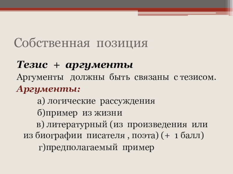 Собственную позицию следует доказать (выдвинуть свой тезис и подкрепить 2-3 аргументами)
