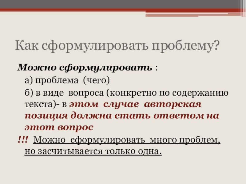 в виде вопроса (конкретно по содержанию текста)- в этом случае авторская позиция должна стать ответом на этот вопрос