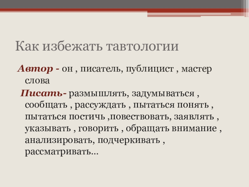 Писать- размышлять, задумываться , сообщать , рассуждать , пытаться понять , пытаться постичь ,повествовать, заявлять , указывать , говорить , обращать внимание , анализировать, подчеркивать , рассматривать…