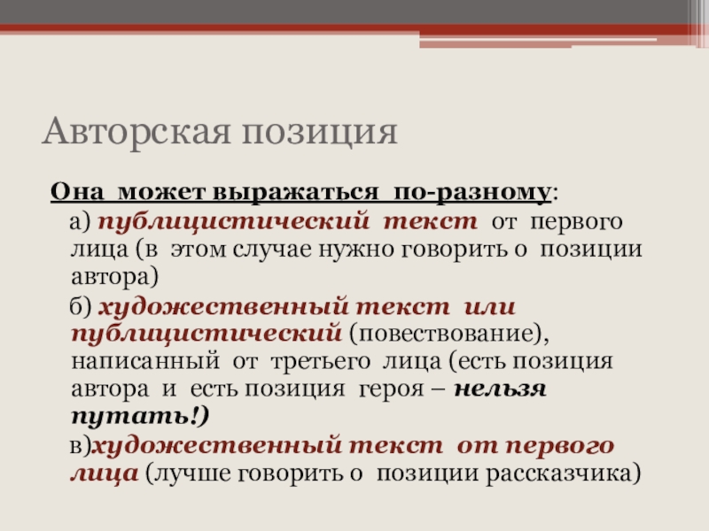 б) художественный текст или публицистический (повествование), написанный от третьего лица (есть позиция автора и есть позиция героя – нельзя путать!)