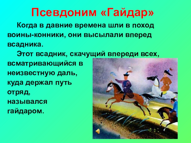 Псевдоним «Гайдар»	Когда в давние времена шли в поход воины-конники, они высылали впередвсадника. 	Этот всадник, скачущий впереди всех,