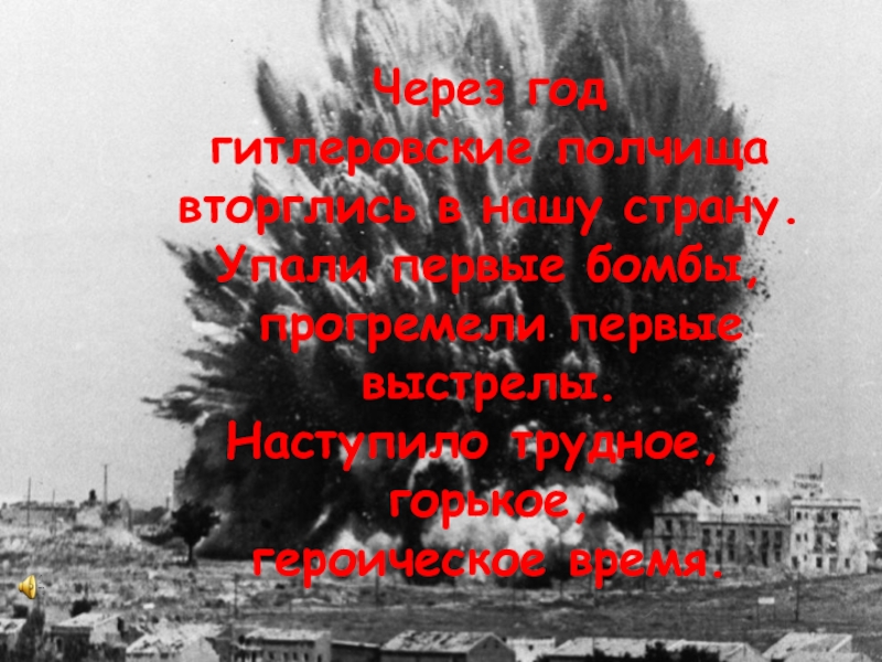 Через год гитлеровские полчища вторглись в нашу страну. Упали первые бомбы, прогремели первые выстрелы. Наступило	 трудное,	горькое,героическое время.