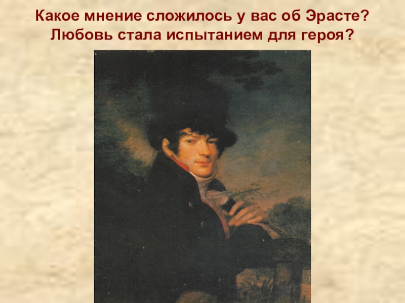 Слайд 10Какое мнение сложилось у вас об Эрасте? Любовь стала испытанием для