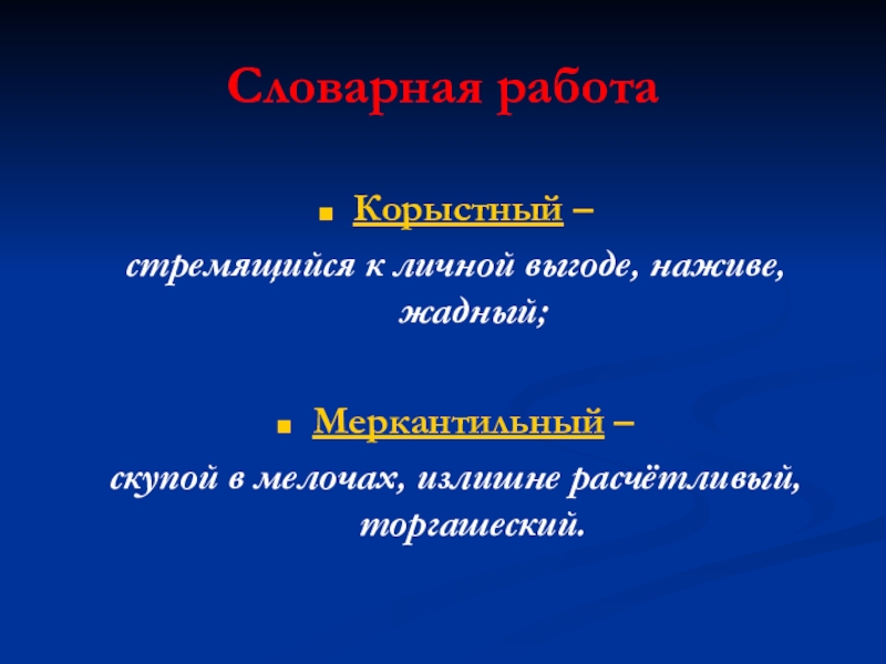 Словарная работаКорыстный – стремящийся к личной выгоде, наживе, жадный;Меркантильный – скупой в мелочах, излишне расчётливый, торгашеский.