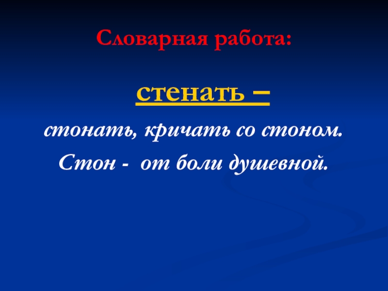Словарная работа:  стенать – стонать, кричать со стоном. Стон - от боли душевной.