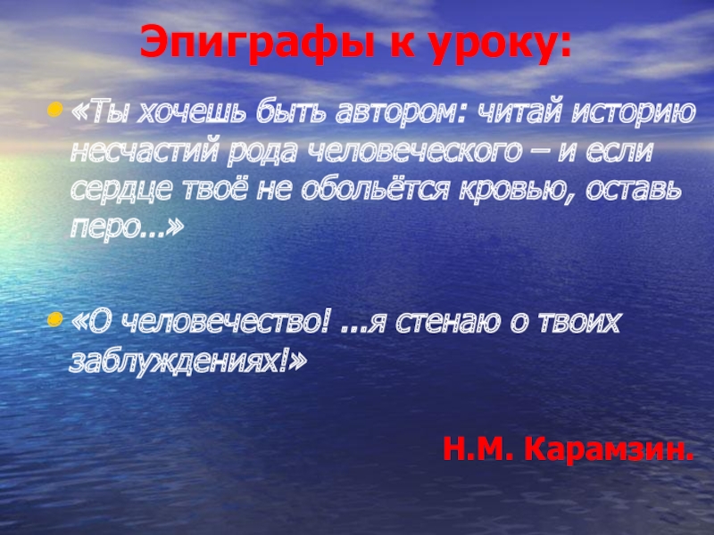 Эпиграфы к уроку:«Ты хочешь быть автором: читай историю несчастий рода человеческого – и если сердце твоё не обольётся кровью, оставь перо…»«О человечество! ...я стенаю о твоих заблуждениях!»