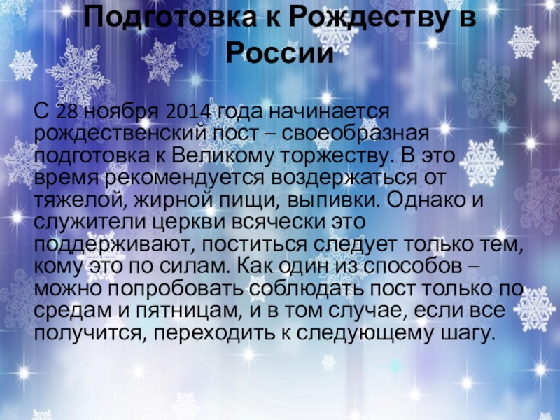 Подготовка к Рождеству в России  С 28 ноября 2014 года начинается рождественский пост – своеобразная подготовка