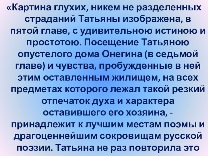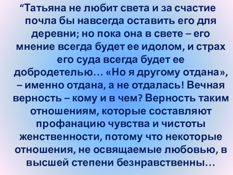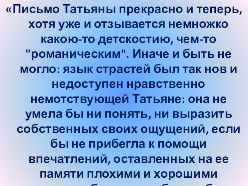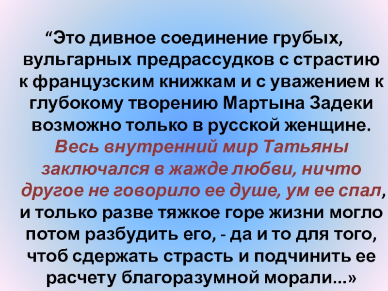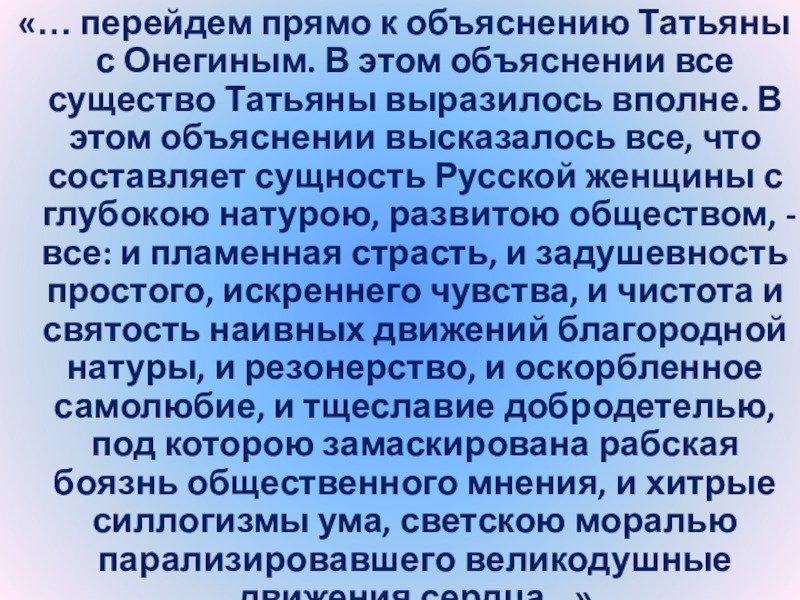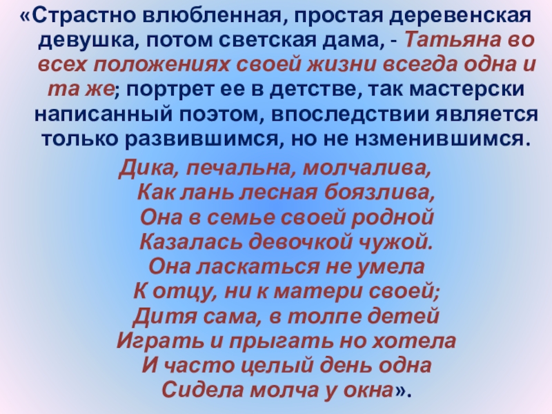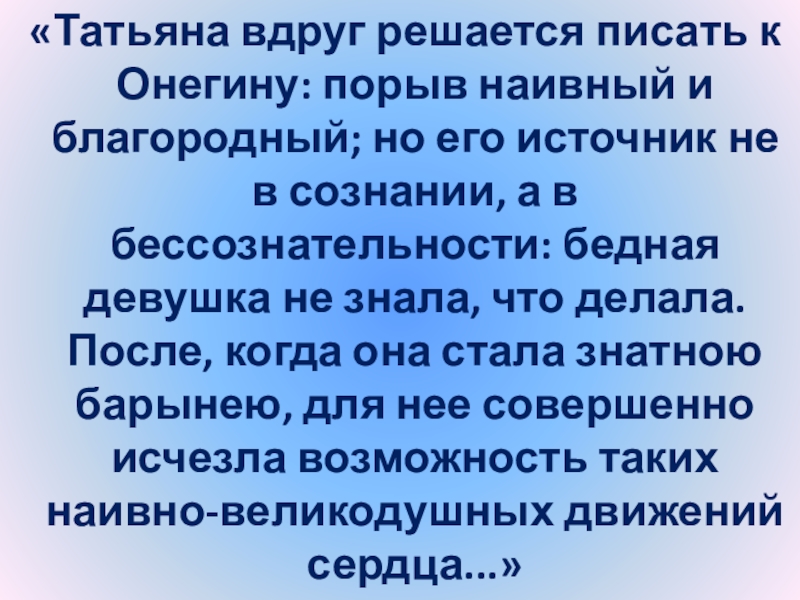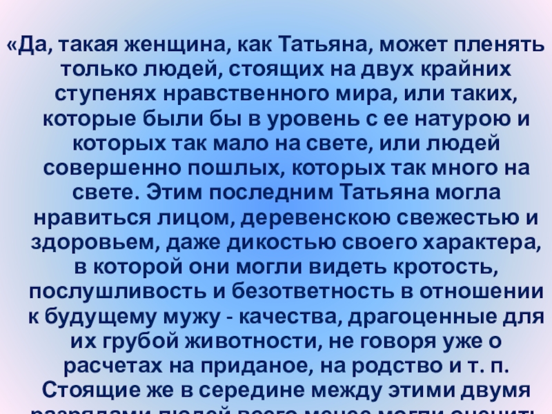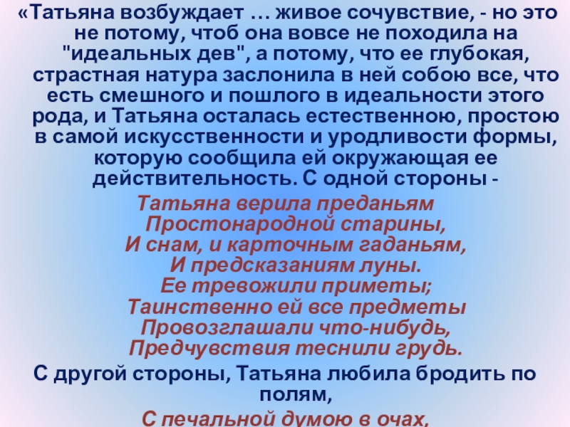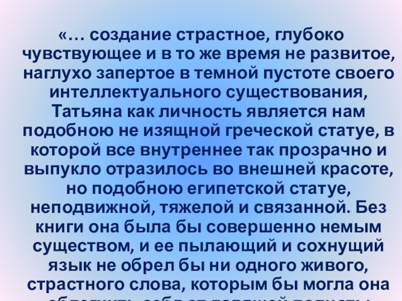 Слайд 24“Татьяна – существо исключительное, натура глубокая, любящая, страстная. Любовь для нее