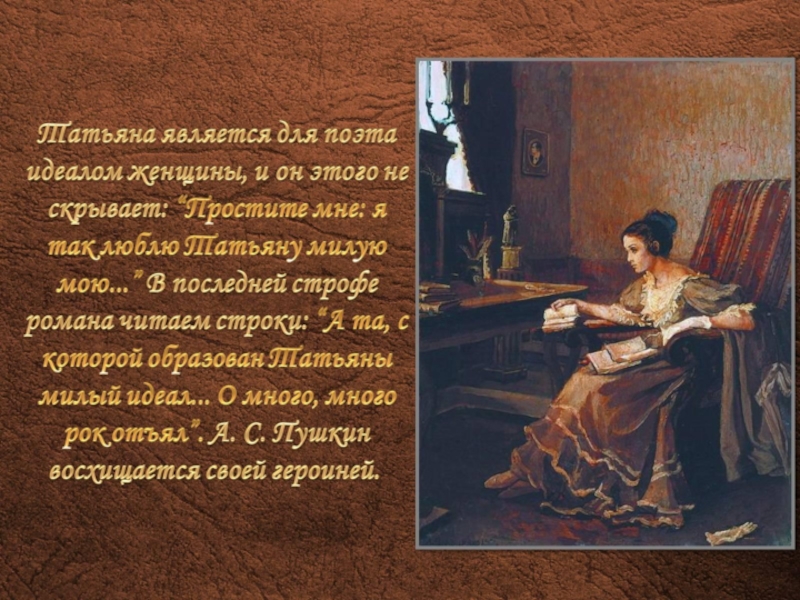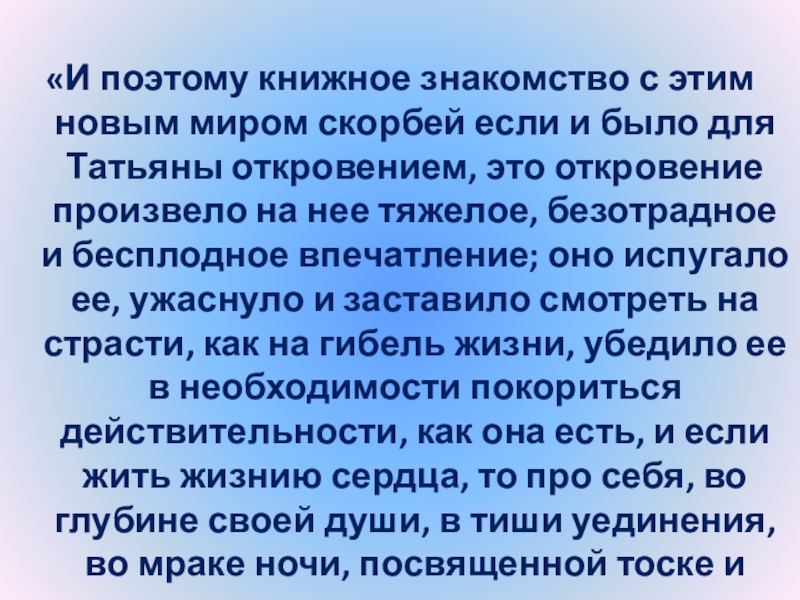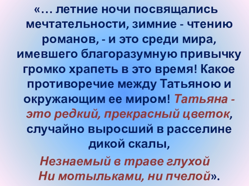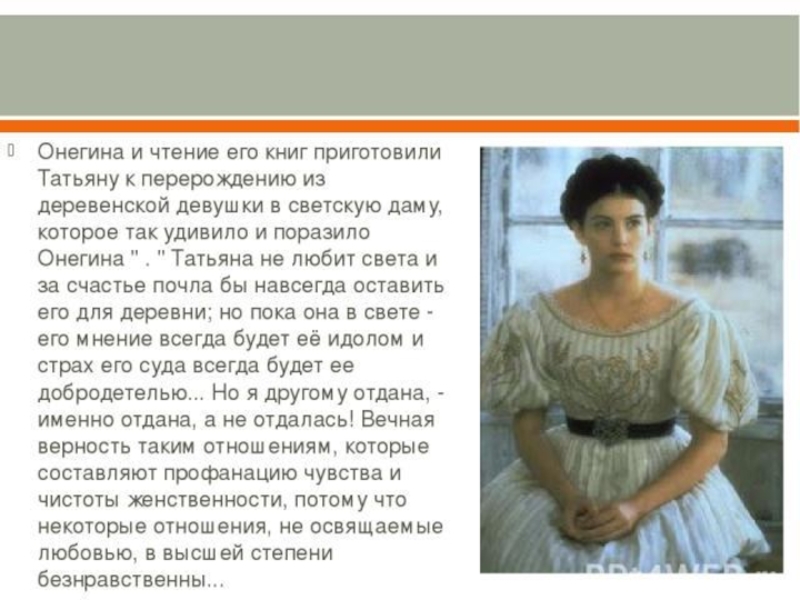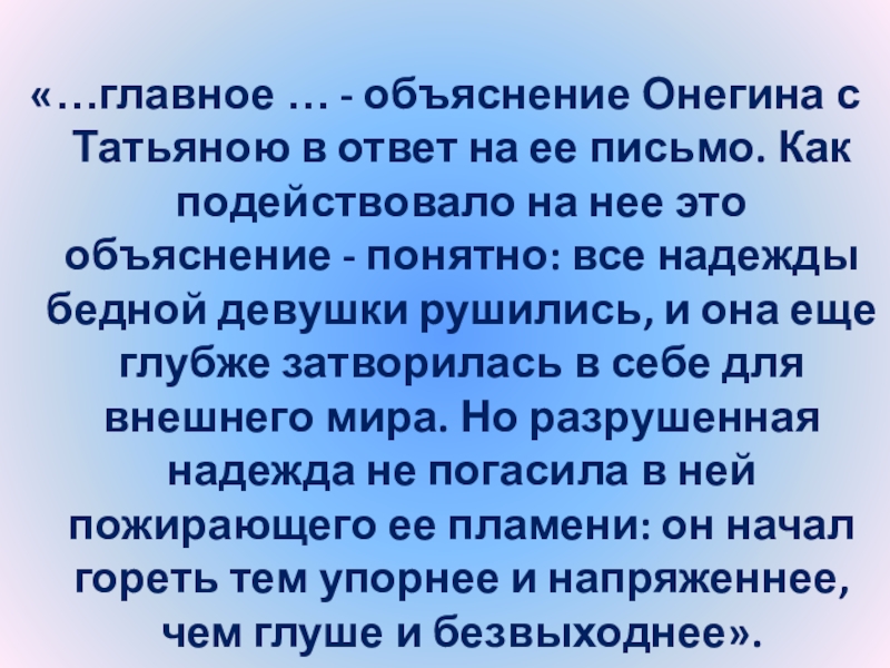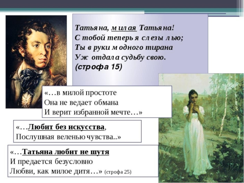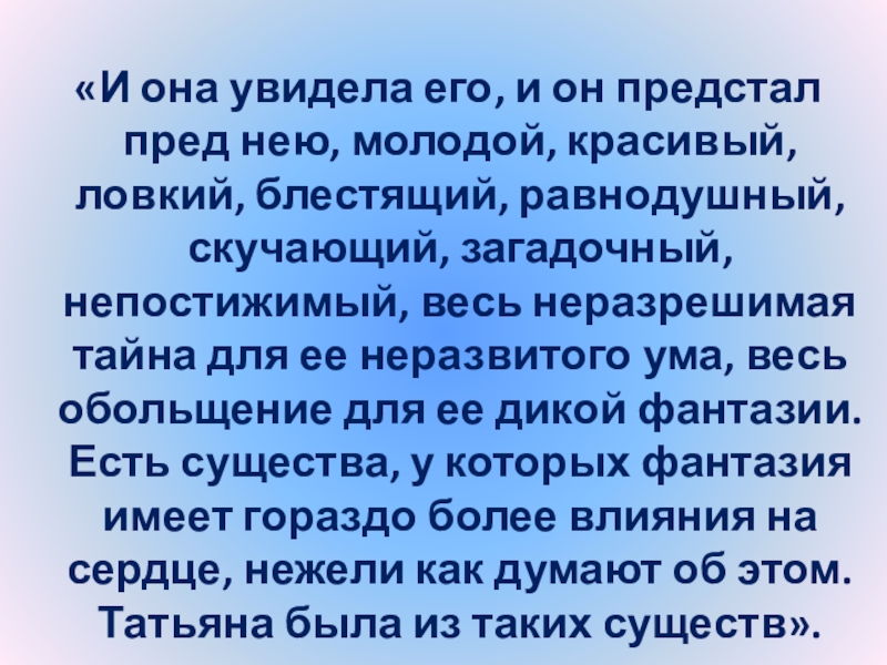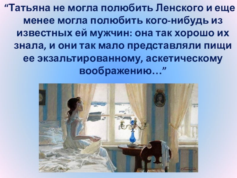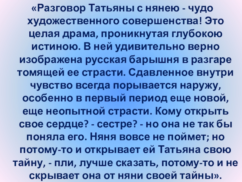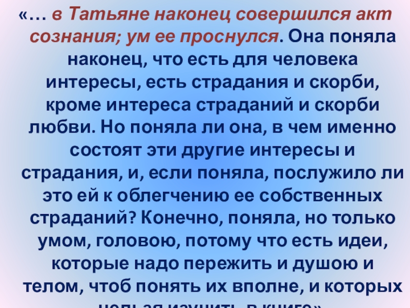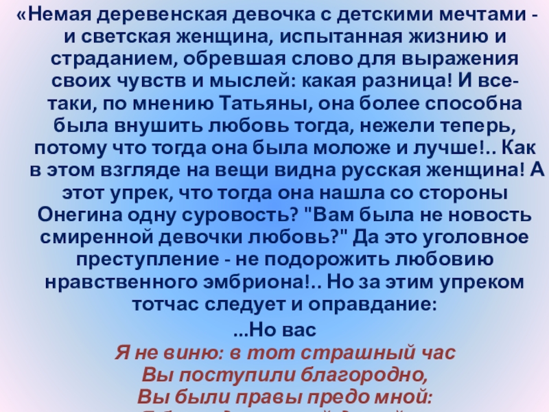 Слайд 24“Татьяна – существо исключительное, натура глубокая, любящая, страстная. Любовь для нее