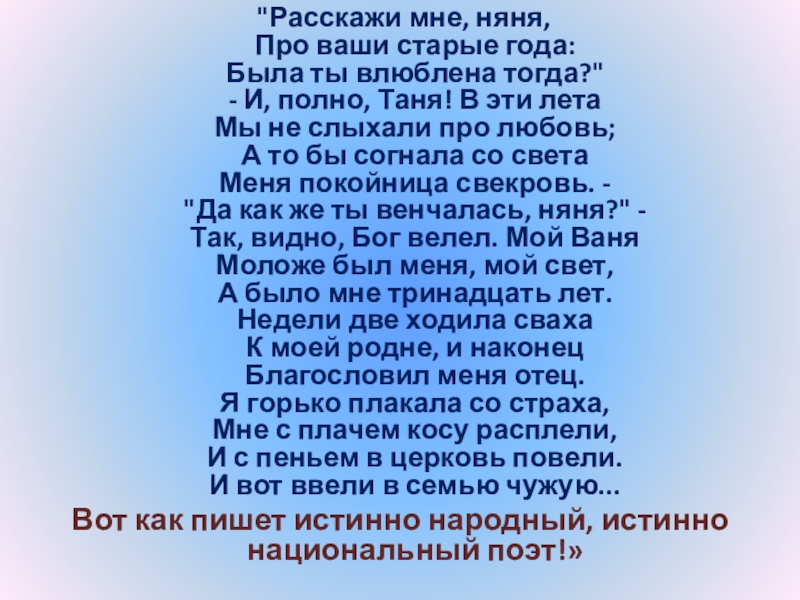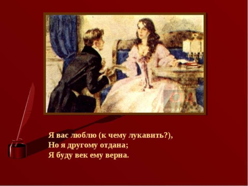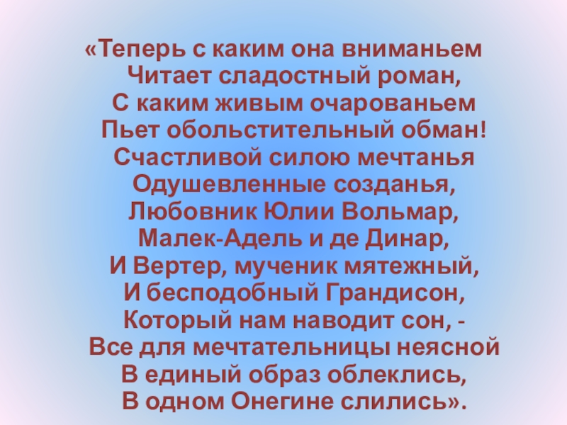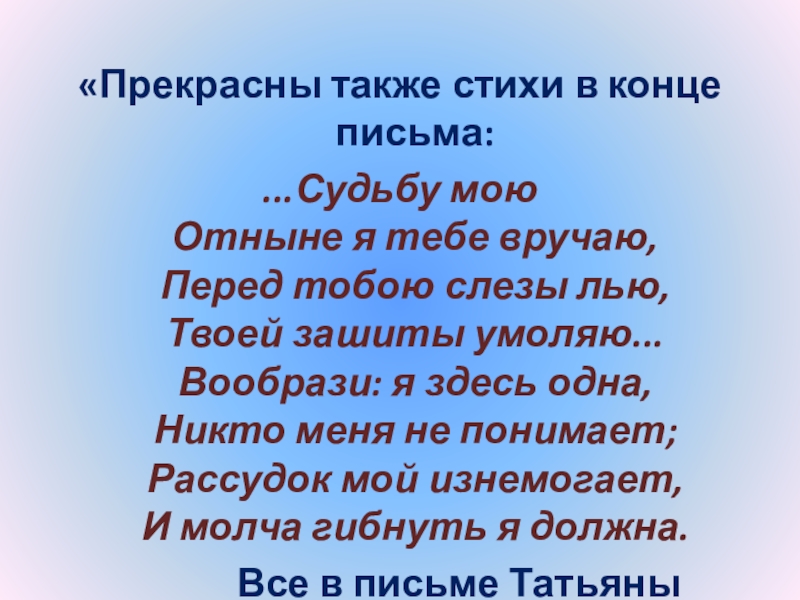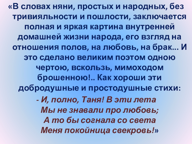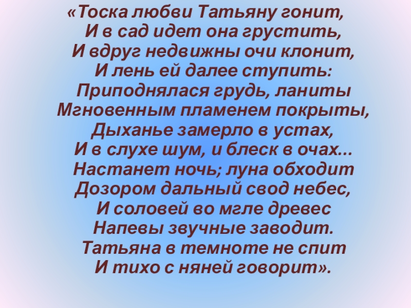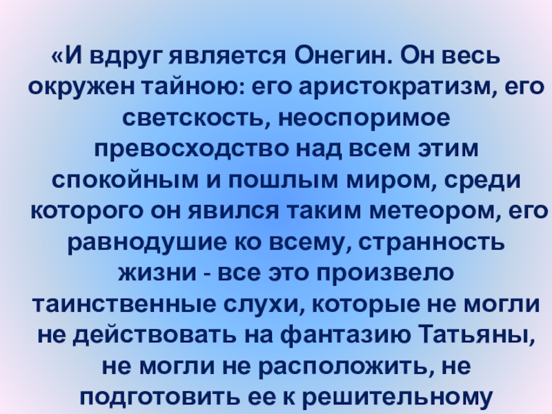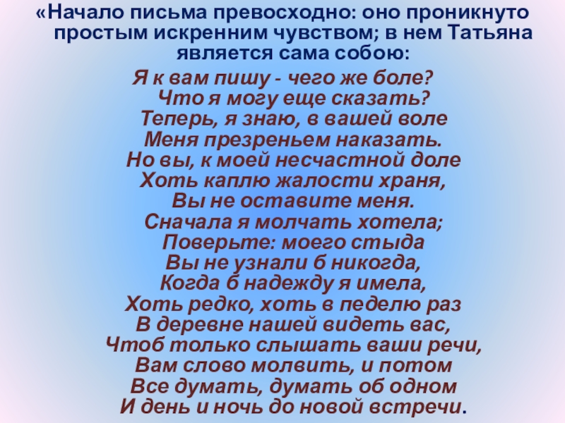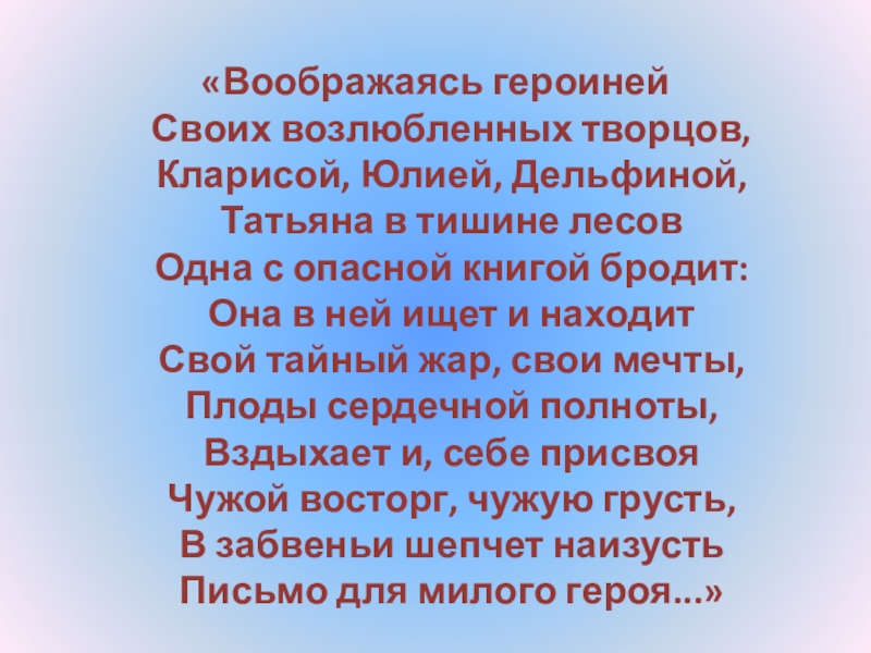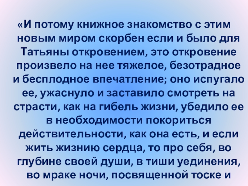 Слайд 24“Татьяна – существо исключительное, натура глубокая, любящая, страстная. Любовь для нее