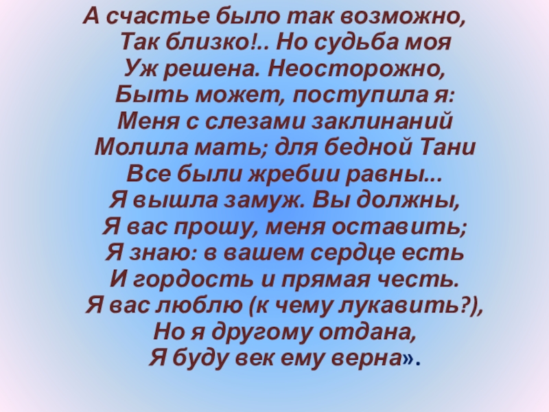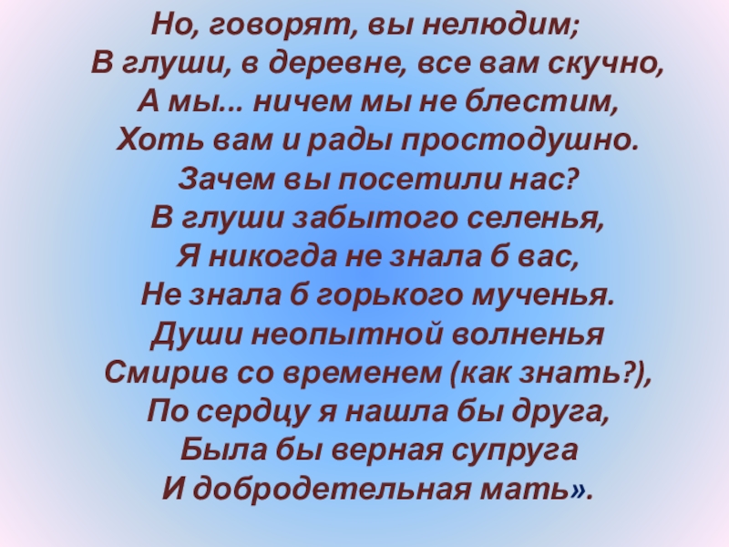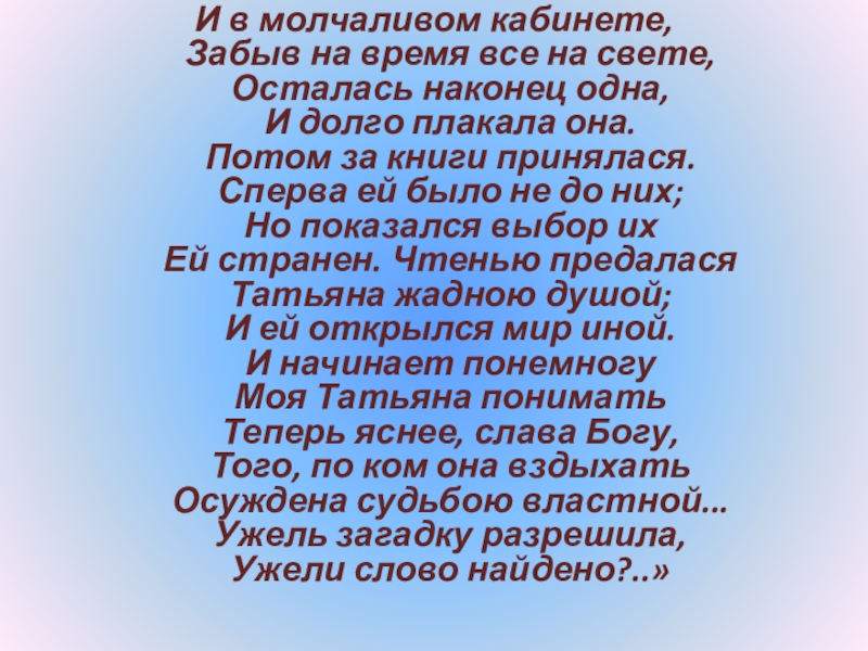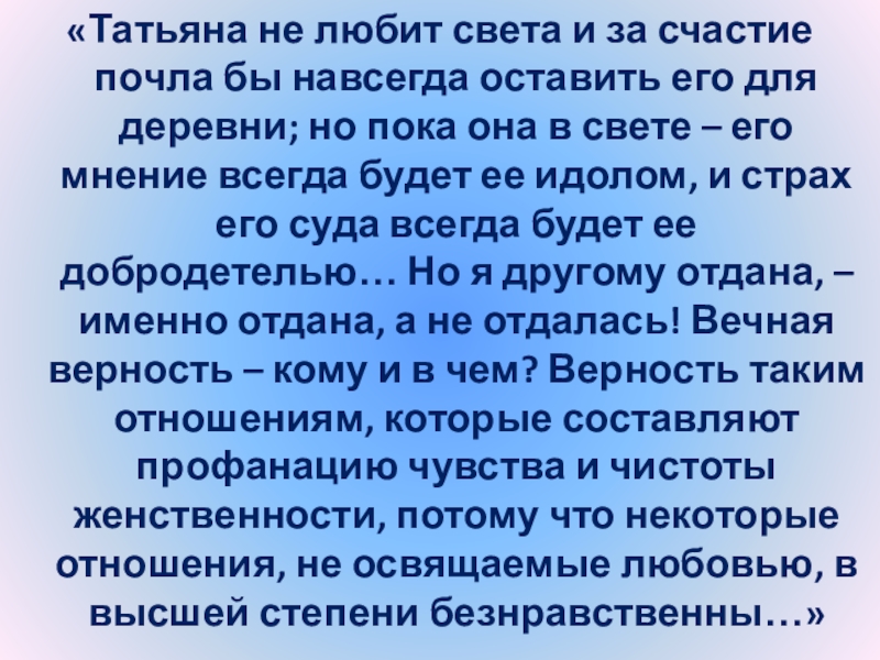 Слайд 127«Татьяна не любит света и за счастие почла бы навсегда оставить