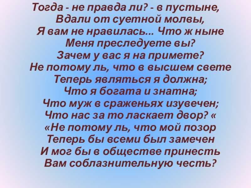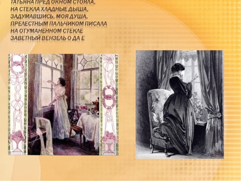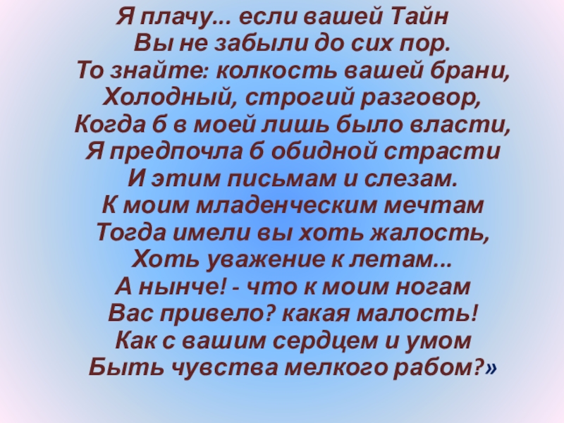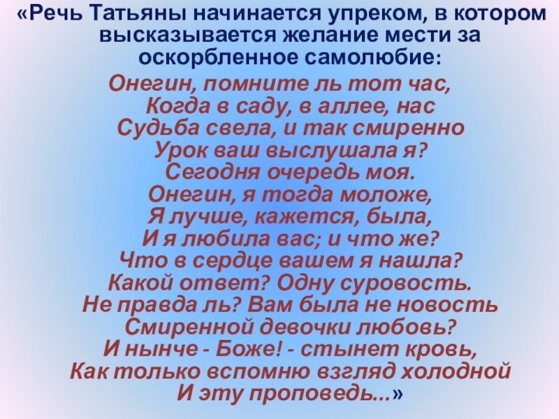 Слайд 102 «Речь Татьяны начинается упреком, в котором высказывается желание мести за