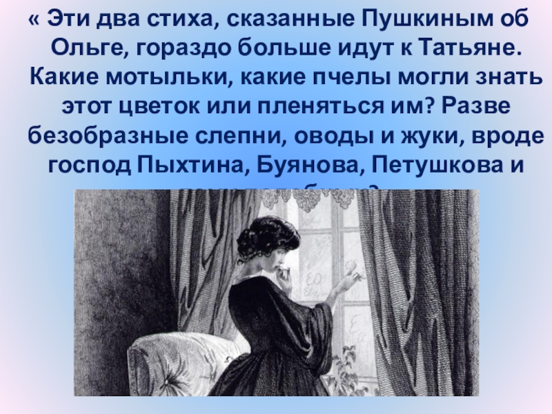 идут к Татьяне. Какие мотыльки, какие пчелы могли знать этот цветок или пленяться им? Разве безобразные слепни, оводы и жуки, вроде господ Пыхтина, Буянова, Петушкова и тому подобных?»