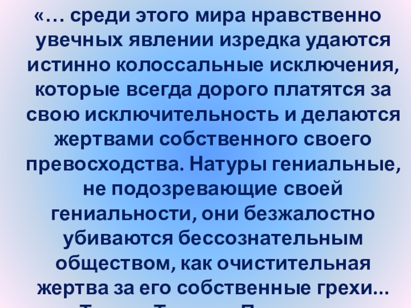 Слайд 6 «… среди этого мира нравственно увечных явлении изредка удаются истинно