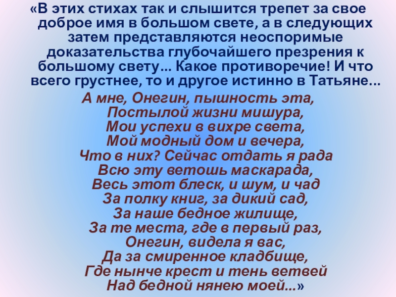в большом свете, а в следующих затем представляются неоспоримые доказательства глубочайшего презрения к большому свету... Какое противоречие! И что всего грустнее, то и другое истинно в Татьяне...