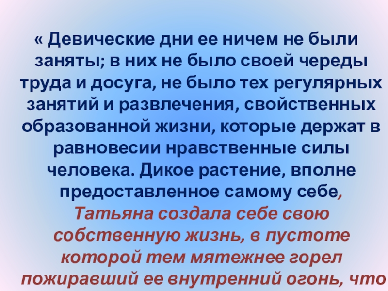 не было своей череды труда и досуга, не было тех регулярных занятий и развлечения, свойственных образованной жизни, которые держат в равновесии нравственные силы человека. Дикое растение, вполне предоставленное самому себе, Татьяна создала себе свою собственную жизнь, в пустоте которой тем мятежнее горел пожиравший ее внутренний огонь, что ее ум ничем не был занят».