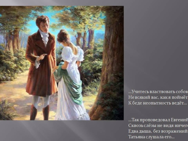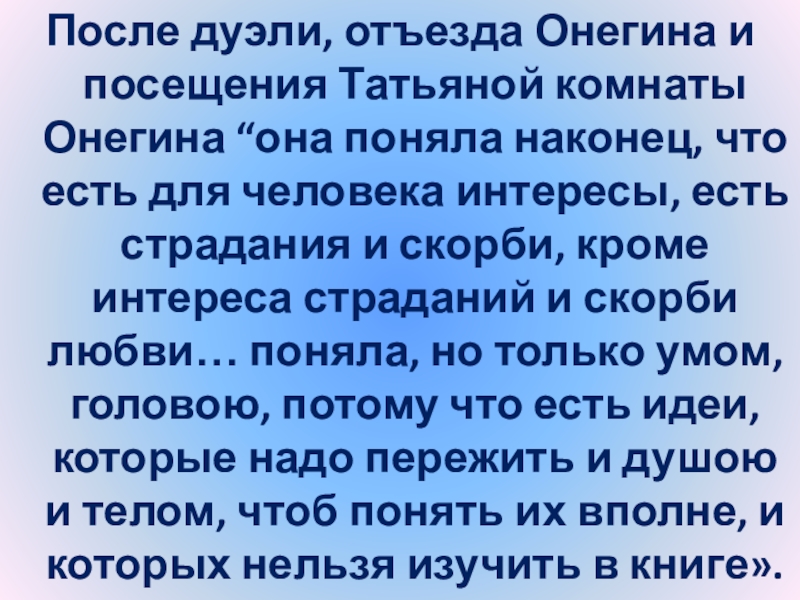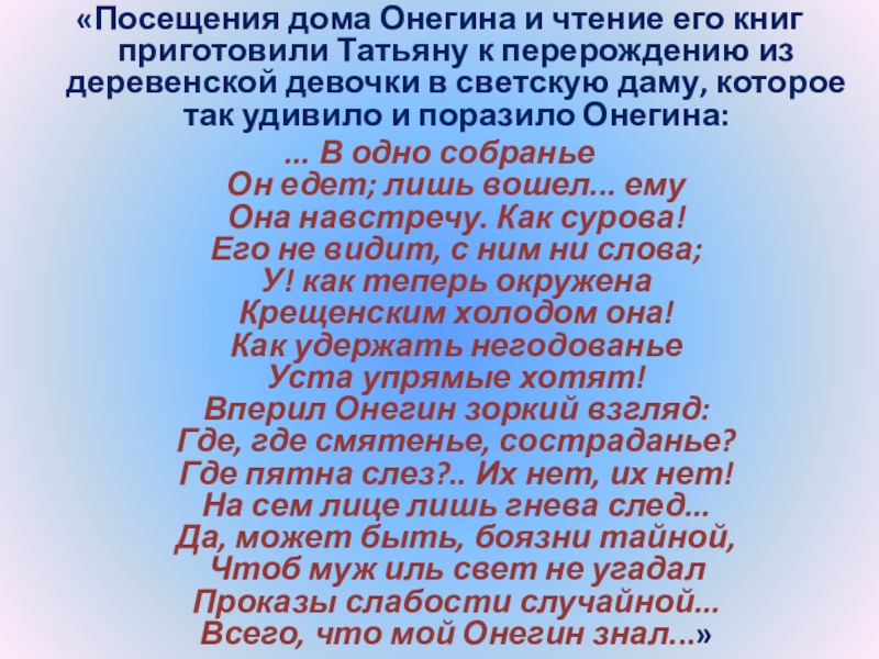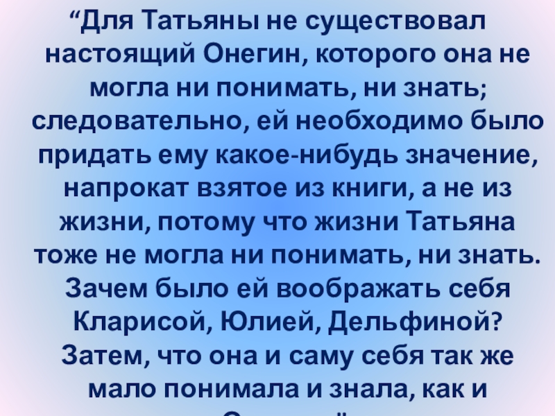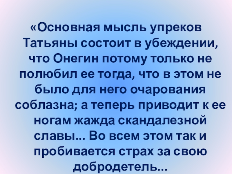 «Основная мысль упреков Татьяны состоит в убеждении, что Онегин потому только