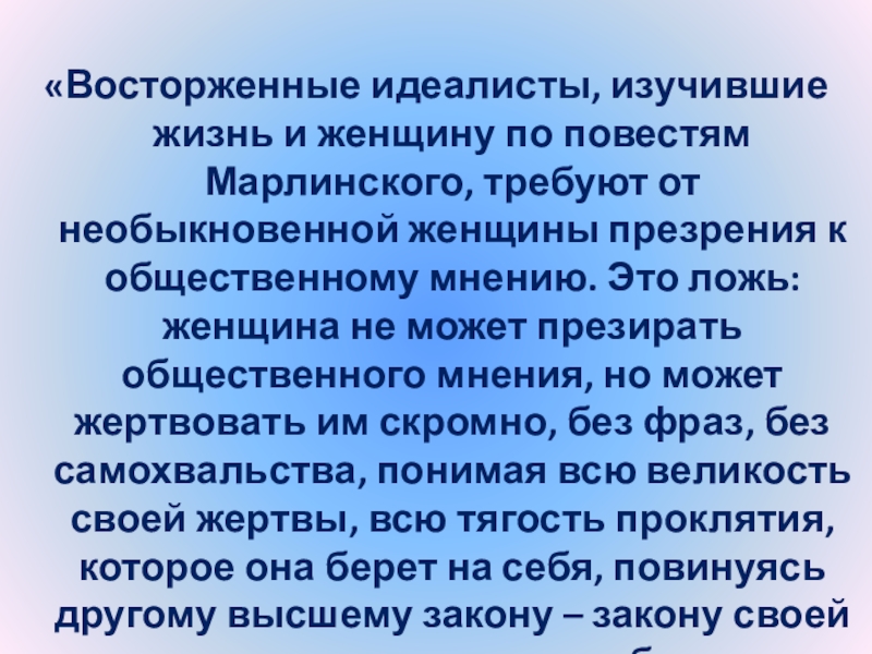 «Восторженные идеалисты, изучившие жизнь и женщину по повестям Марлинского, требуют от