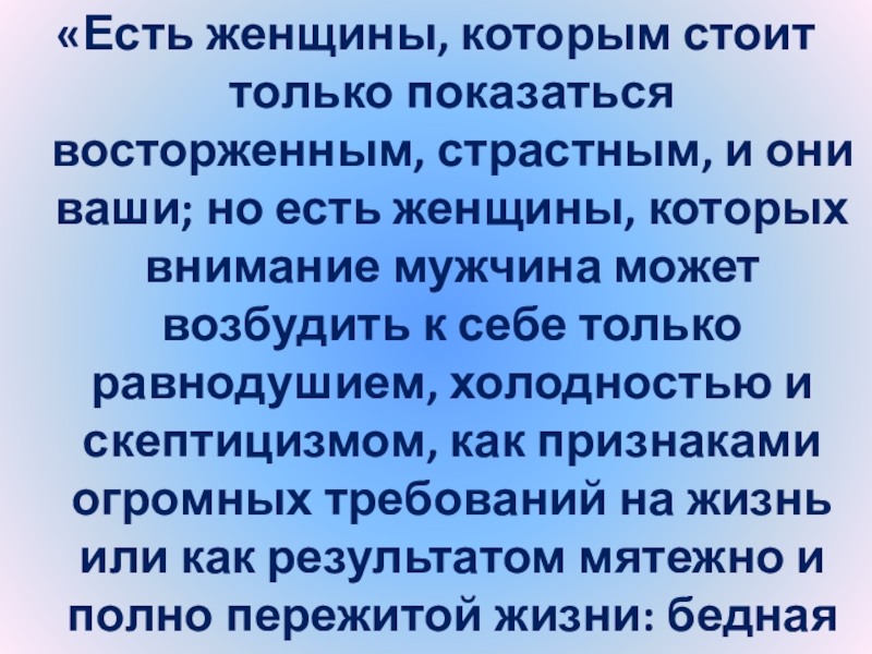 Слайд 123«Жизнь женщины по преимуществу сосредоточена в жизни сердца; любить - значит