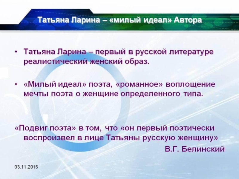 нет этих болезненных противоречий, которыми страдают слишком сложные натуры; Татьяна создана как будто вся из одного цельного куска, без всяких придел он и примесей. Вся жизнь ее проникнута тою целостностью, тем единством, которое в мире искусства составляет высочайшее достоинство художественного произведения».