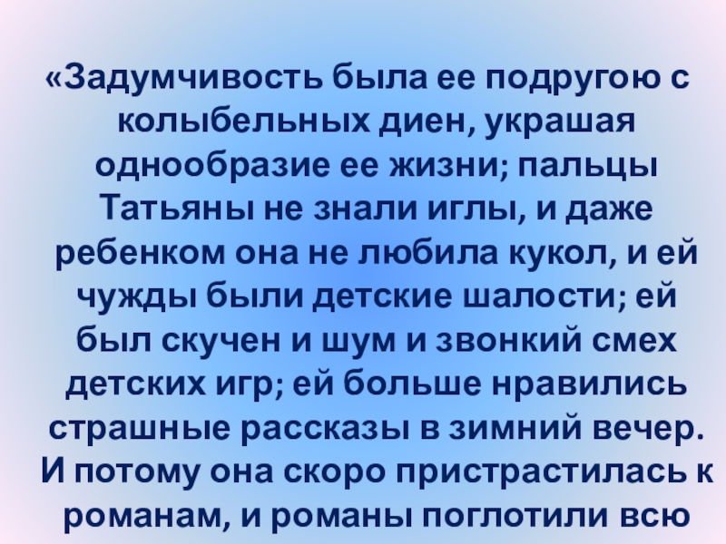 жизни; пальцы Татьяны не знали иглы, и даже ребенком она не любила кукол, и ей чужды были детские шалости; ей был скучен и шум и звонкий смех детских игр; ей больше нравились страшные рассказы в зимний вечер. И потому она скоро пристрастилась к романам, и романы поглотили всю жизнь ее».
