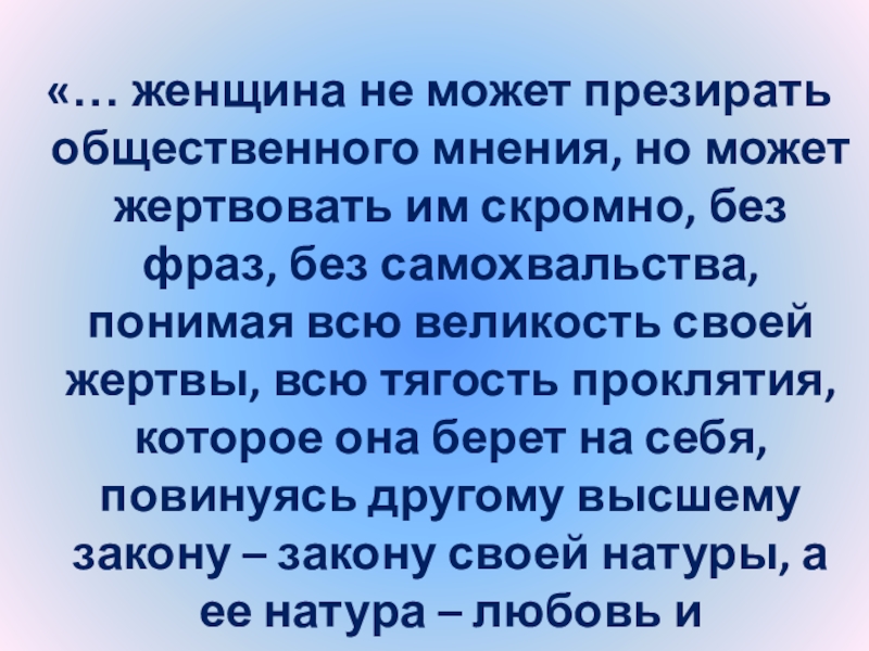 им скромно, без фраз, без самохвальства, понимая всю великость своей жертвы, всю тягость проклятия, которое она берет на себя, повинуясь другому высшему закону – закону своей натуры, а ее натура – любовь и самопожертвование…”