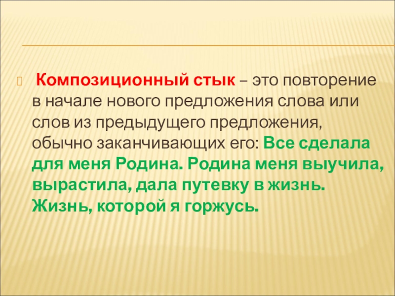 или слов из предыдущего предложения, обычно заканчивающих его: Все сделала для меня Родина. Родина меня выучила, вырастила, дала путевку в жизнь. Жизнь, которой я горжусь.