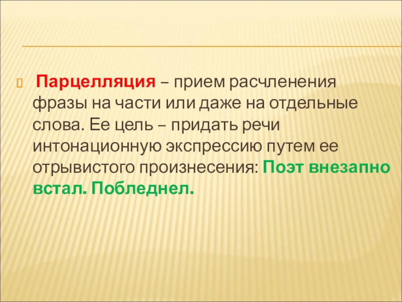 Слайд 41 Парцелляция – прием расчленения фразы на части или даже на