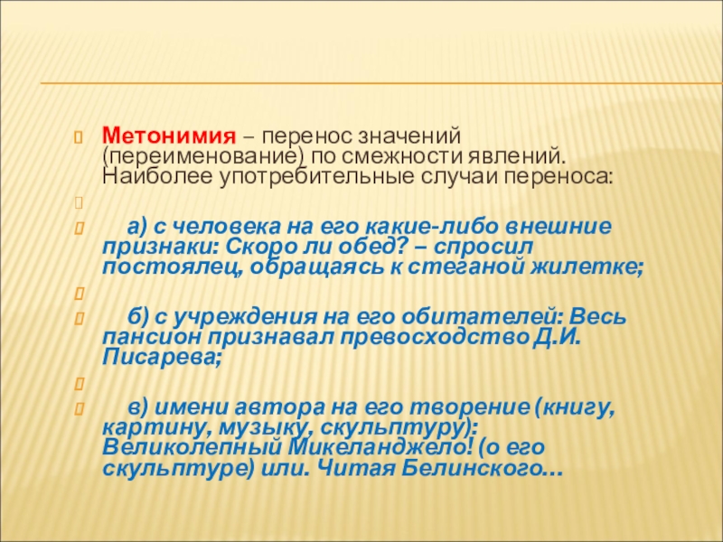 Слайд 15Метонимия – перенос значений (переименование) по смежности явлений. Наиболее употребительные случаи