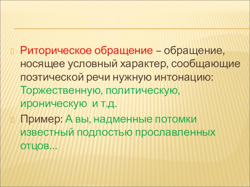 Слайд 35Риторическое обращение – обращение, носящее условный характер, сообщающие поэтической речи нужную