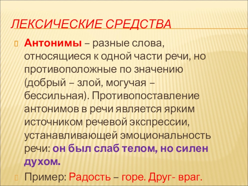 противоположные по значению (добрый – злой, могучая – бессильная). Противопоставление антонимов в речи является ярким источником речевой экспрессии, устанавливающей эмоциональность речи: он был слаб телом, но силен духом.