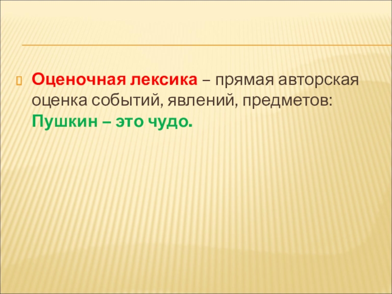 Слайд 21Оценочная лексика – прямая авторская оценка событий, явлений, предметов: Пушкин –