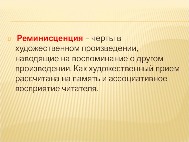 Слайд 28 Реминисценция – черты в художественном произведении, наводящие на воспоминание о