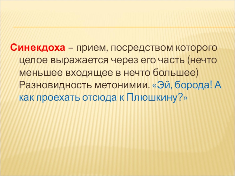меньшее входящее в нечто большее) Разновидность метонимии. «Эй, борода! А как проехать отсюда к Плюшкину?»