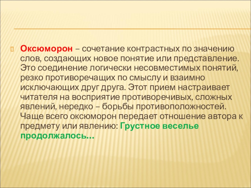представление. Это соединение логически несовместимых понятий, резко противоречащих по смыслу и взаимно исключающих друг друга. Этот прием настраивает читателя на восприятие противоречивых, сложных явлений, нередко – борьбы противоположностей. Чаще всего оксюморон передает отношение автора к предмету или явлению: Грустное веселье продолжалось…