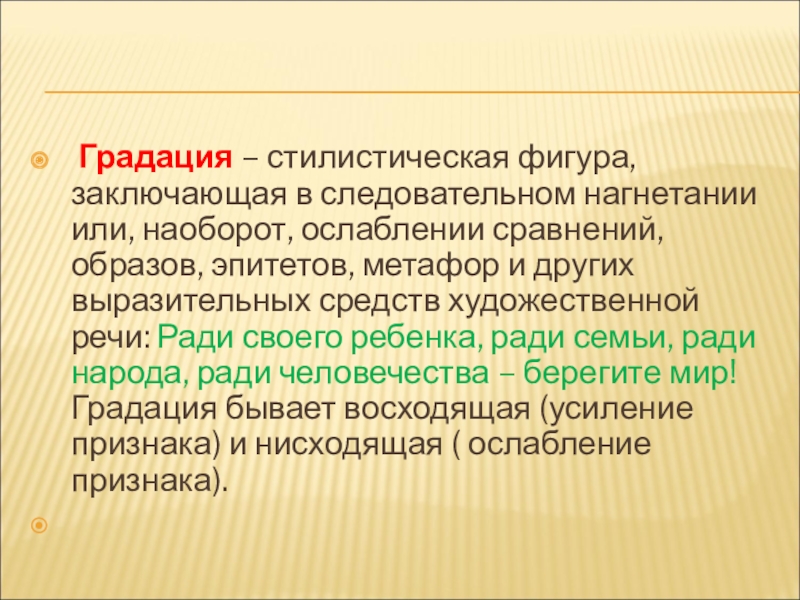 ослаблении сравнений, образов, эпитетов, метафор и других выразительных средств художественной речи: Ради своего ребенка, ради семьи, ради народа, ради человечества – берегите мир! Градация бывает восходящая (усиление признака) и нисходящая ( ослабление признака).
