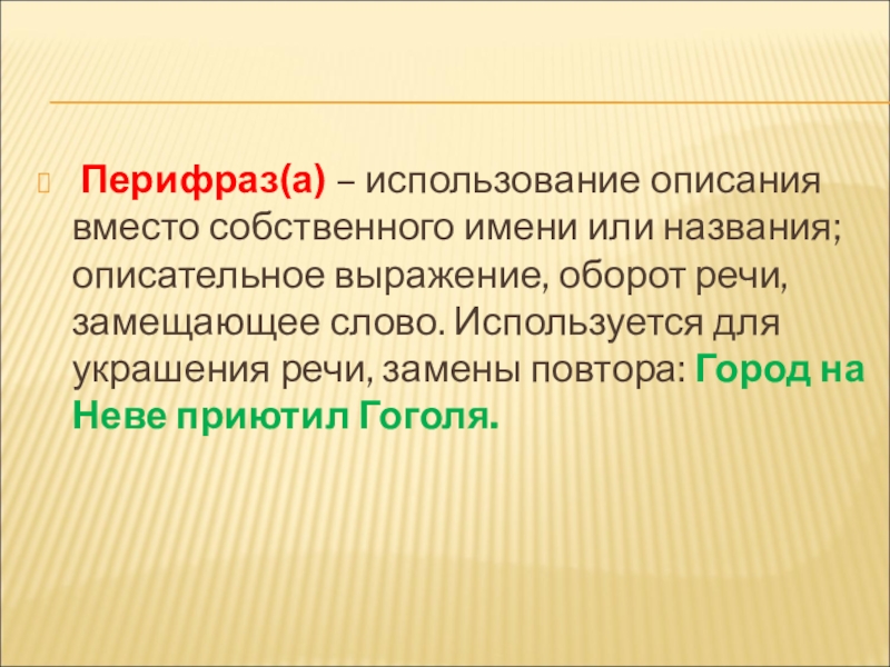 Слайд 22 Перифраз(а) – использование описания вместо собственного имени или названия; описательное