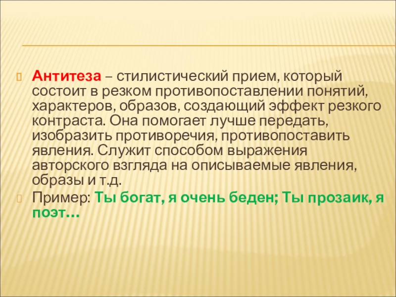 Слайд 44Антитеза – стилистический прием, который состоит в резком противопоставлении понятий, характеров,