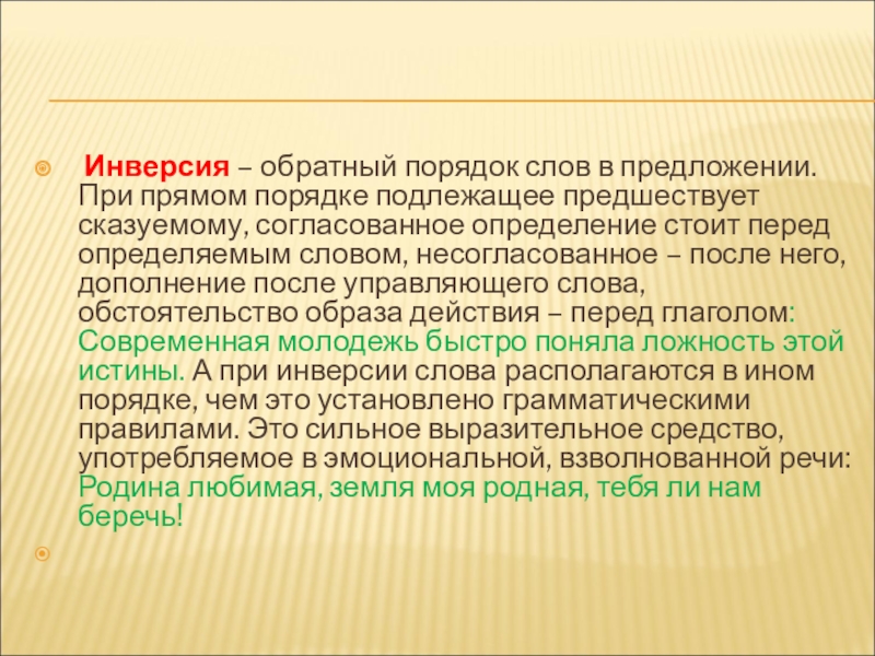 подлежащее предшествует сказуемому, согласованное определение стоит перед определяемым словом, несогласованное – после него, дополнение после управляющего слова, обстоятельство образа действия – перед глаголом: Современная молодежь быстро поняла ложность этой истины. А при инверсии слова располагаются в ином порядке, чем это установлено грамматическими правилами. Это сильное выразительное средство, употребляемое в эмоциональной, взволнованной речи: Родина любимая, земля моя родная, тебя ли нам беречь!