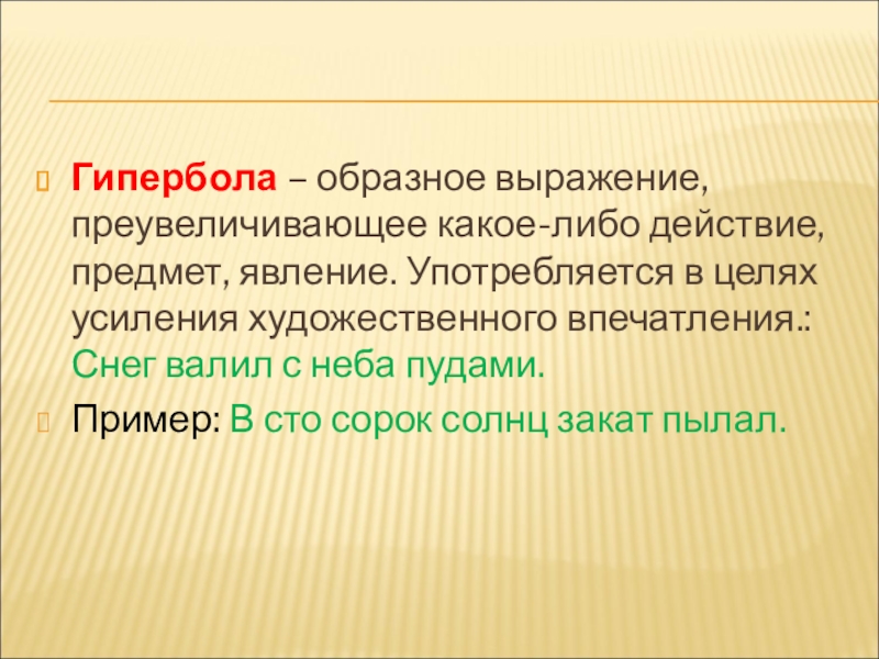 Слайд 13Гипербола – образное выражение, преувеличивающее какое-либо действие, предмет, явление. Употребляется в