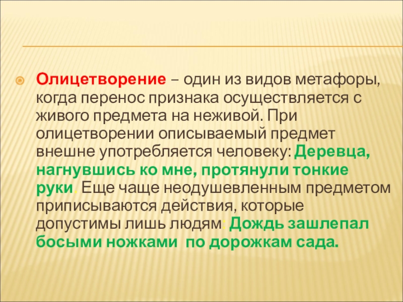 живого предмета на неживой. При олицетворении описываемый предмет внешне употребляется человеку: Деревца, нагнувшись ко мне, протянули тонкие руки. Еще чаще неодушевленным предметом приписываются действия, которые допустимы лишь людям: Дождь зашлепал босыми ножками по дорожкам сада.