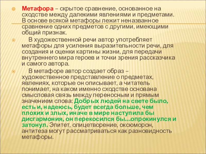 В метафоре автор создает образ – художественное представление о предметах, явлениях, которые он описывает, а читатель понимает, на каком именно сходстве основана смысловая связь между переносным и прямым значением слова: Добрых людей на свете было, есть и, надеюсь, будет всегда больше, чем плохих и злых, иначе в мире наступила бы дисгармония, он перекосился бы…опрокинулся и затонул. Эпитет, олицетворение, оксюморон, антитеза могут рассматриваться как разновидность метафоры.