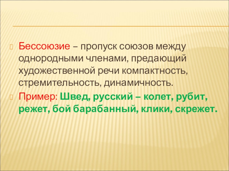 Слайд 30Бессоюзие – пропуск союзов между однородными членами, предающий художественной речи компактность,