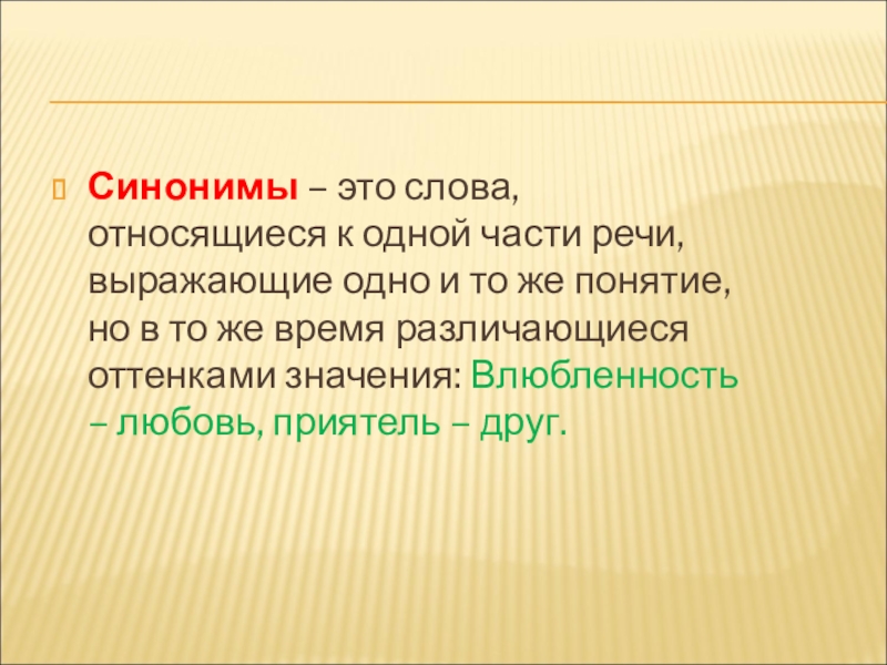и то же понятие, но в то же время различающиеся оттенками значения: Влюбленность – любовь, приятель – друг.