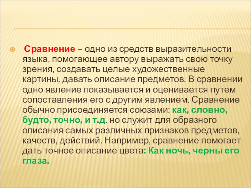 свою точку зрения, создавать целые художественные картины, давать описание предметов. В сравнении одно явление показывается и оценивается путем сопоставления его с другим явлением. Сравнение обычно присоединяется союзами: как, словно, будто, точно, и т.д. но служит для образного описания самых различных признаков предметов, качеств, действий. Например, сравнение помогает дать точное описание цвета: Как ночь, черны его глаза.