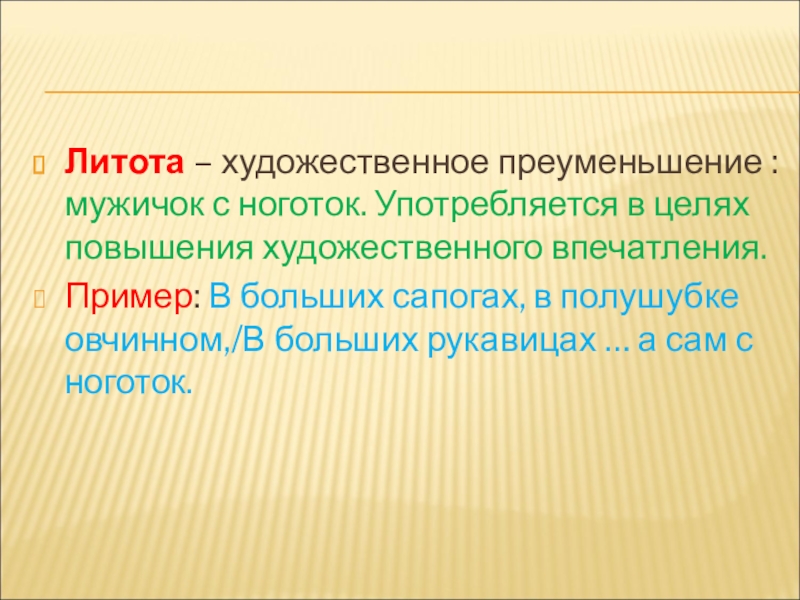 Слайд 14Литота – художественное преуменьшение : мужичок с ноготок. Употребляется в целях