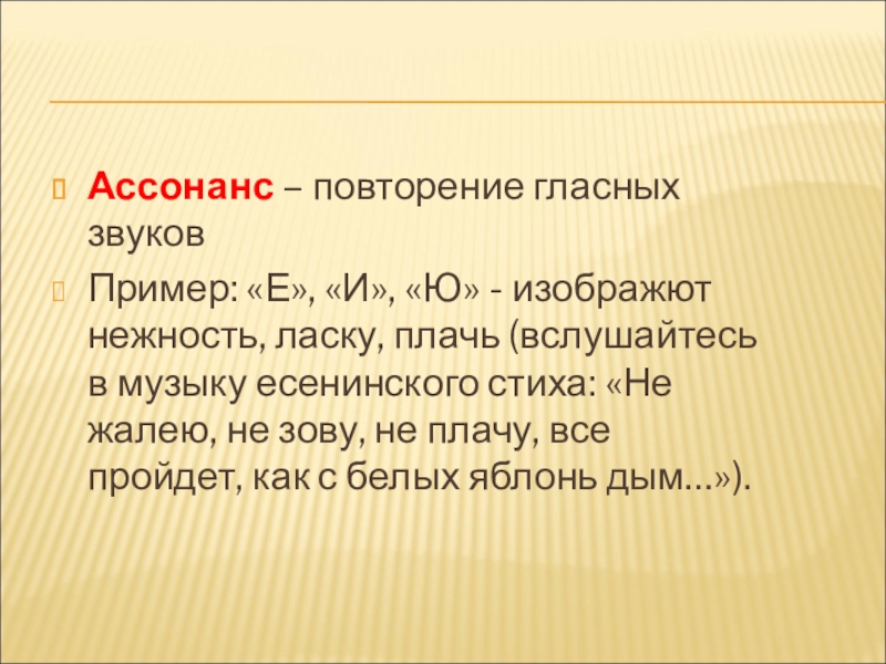 ласку, плачь (вслушайтесь в музыку есенинского стиха: «Не жалею, не зову, не плачу, все пройдет, как с белых яблонь дым…»).