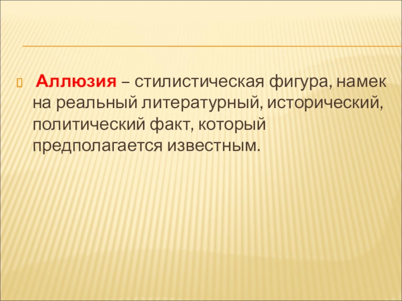 Слайд 26 Аллюзия – стилистическая фигура, намек на реальный литературный, исторический, политический